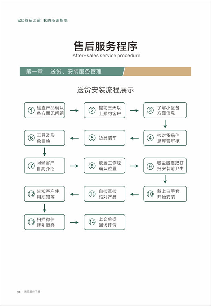 1、根據約定時間至少提前5分鐘上門,送貨安裝服務人員到達客戶所在小區或單元時需立即電話或微信通知客戶;