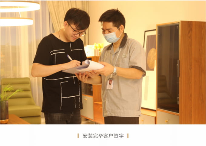 安裝并檢查完所有工作后,需與客戶清點并確認產品,將所有帶電源的家具插上電源,告知客戶家具使用方法和功能及保養知識、注意事項等。所有帶功能的產品需演示給客戶看。例: