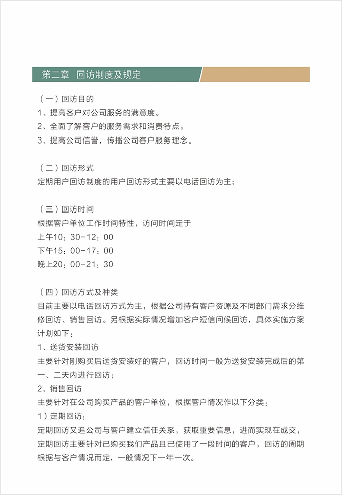 并將有客戶簽名的售后跟蹤單交給店長。店長根據處理完成結果登記存檔,并對客戶進行回訪,確定售后處理完成,并了解客戶對公司整個服務過程的滿意情況。作為對維修處理人員的考核內容之一。