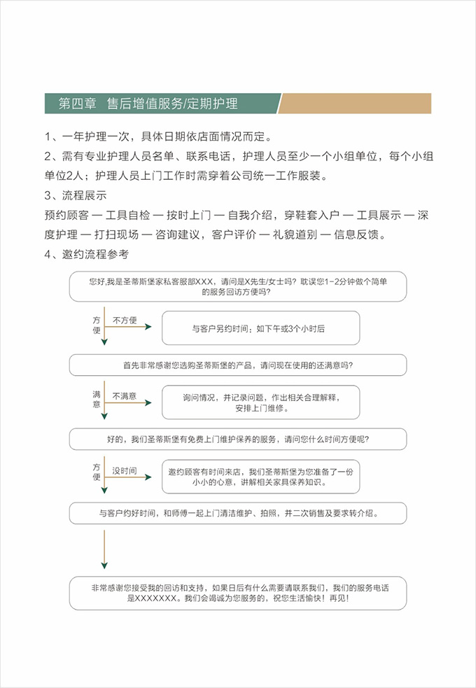 產品處理完畢后必須一站式通檢,指導客戶使用,并將服務過程中產生的垃圾隨手帶走,家具維修完畢后,應用毛巾將家具擦拭一遍,確保產品清潔。