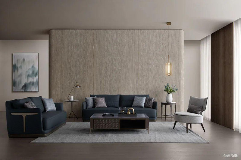疏朗大氣的客廳空間,整體采用低明度的木紋色,在保留實木質感同時,也為空間增添了一縷木香。沙發線條利落干凈,深邃而浪漫的配色仿佛將居者帶進了海洋世界。藝術編制皮料搭配金屬底座,時尚大氣質感撲面而來,將理性和感性完美結合,提高了居家的時尚格調。