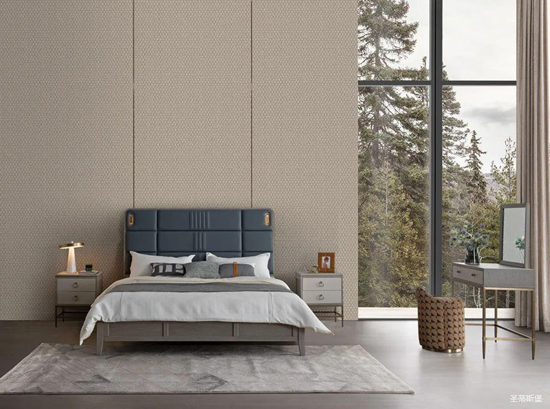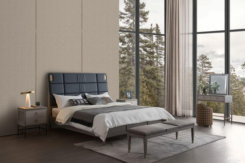主臥擁有貼近自然的魔力,藍色床屏色彩與外界的自然綠相互吸引,凹凸的線性塊狀軟包設計,線條輕盈又流暢,打造了臥室背景強烈的立體感,金屬包裹的感應小夜燈,守護你的每個夜晚,令睡眠更具安全感。
