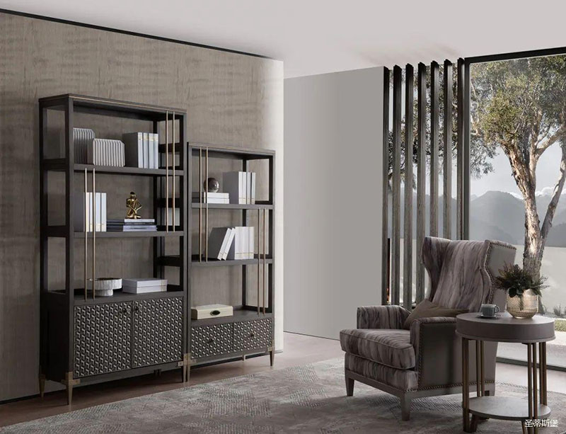 沉靜雅致的書房空間,溫潤實木與硬朗金屬線條相互配合,運用基礎幾何,打造空間的高級感。輕奢質感緩緩流淌,書籍整齊,擺件精致,無一不追求著精致細節與極致的品味,營造出時尚與沉穩并列的氛圍,詮釋著居者對是生活環境的內在追求。