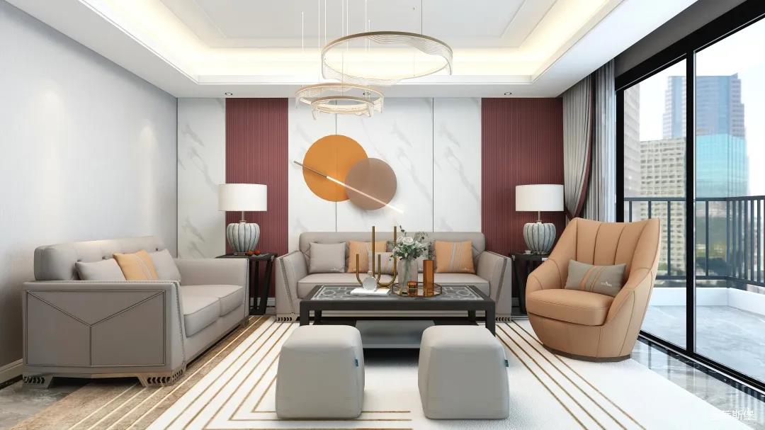 客廳在空間擺設上錯落有致,看似不統一的空間,在觀感上卻給人以整齊劃一的感官體驗,諾大的客廳區域由于大面積落地窗設計,充滿了自然光線,營造明亮和舒適的氛圍感,細節的幾何型燈具為室內增加照明強度,增添了溫馨感。現代的簡潔與美式輕奢的氣質相結合,散發著沉穩,而又不失清新的優雅格調。