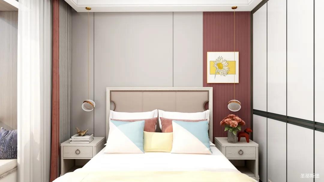 兒童空間雖不及其他空間寬敞,但細節設計更為貼心,淡粉的床屏與酒紅木飾面形成深淺色的對比,色彩跳躍,洋溢著兒童應有的青春活力。床前的閱讀燈,讓空間設計感up的同時,也便利了兒童的閱讀學習。