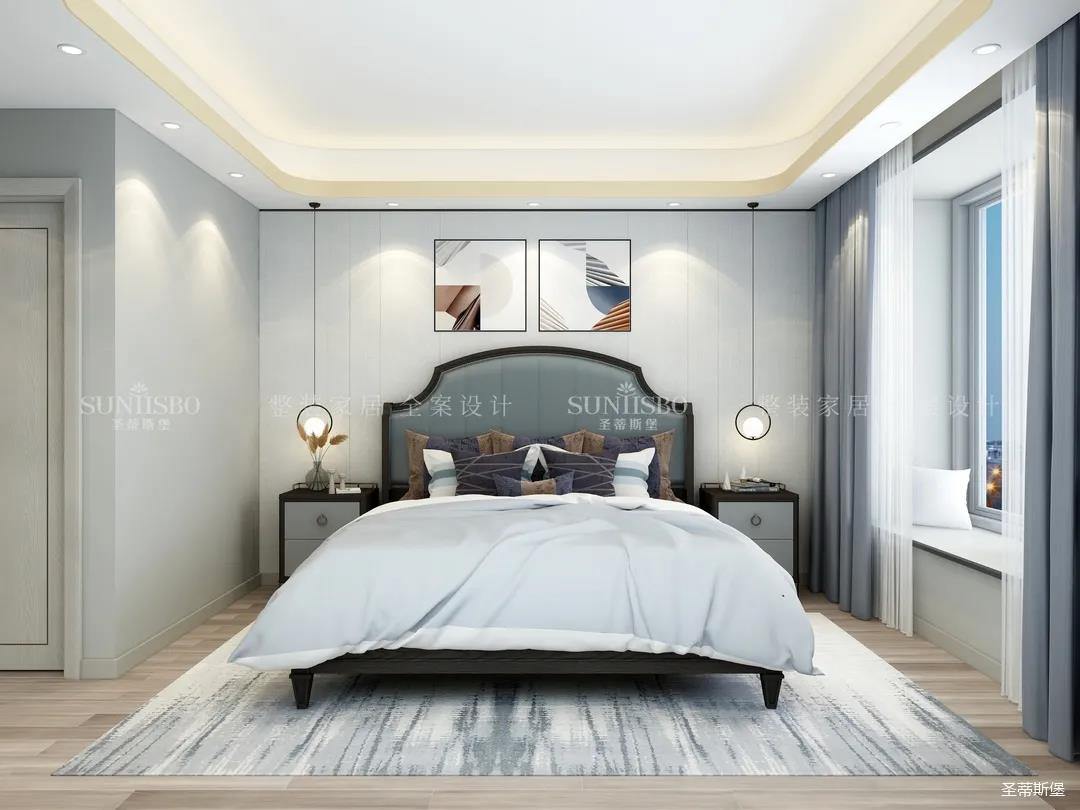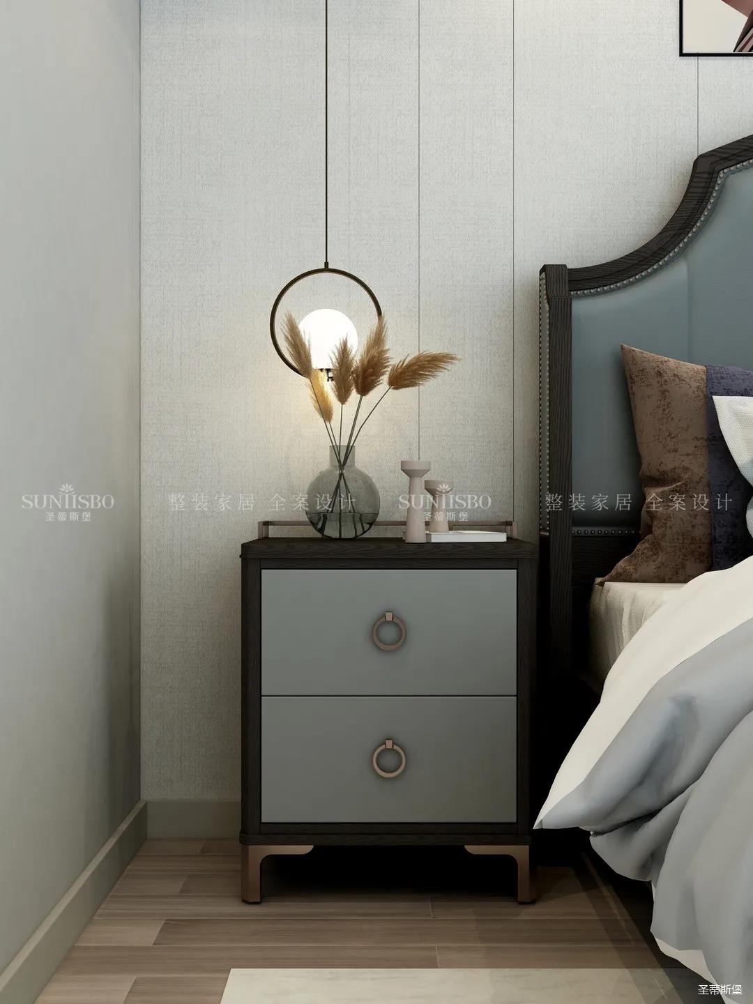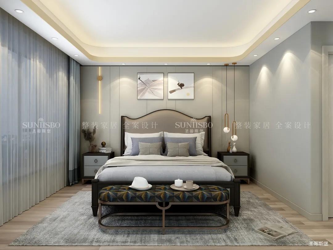 主臥整體暖色色系為空間注入了專屬調性,高明度的家具色彩與整體空間區分,透過材質肌理與光線相互交疊,傳達著空間里安定溫暖的情緒。立體輕奢的床尾凳,提示著空間主人對時尚的高質量生活追求。