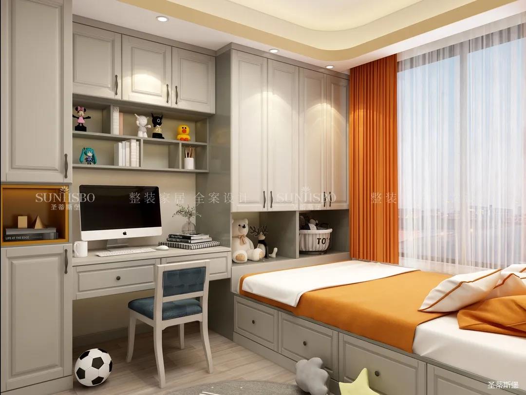 為給小朋友提供良好的居住環境,兒童房功能一應俱全,兼具開放式與封閉收納,將兒童的學習區與休息區合理劃分,打造了一個良好的生活習性,仿古白的整體柜,巧妙的將明亮橙作為撞色,令空間充滿童趣與活力。