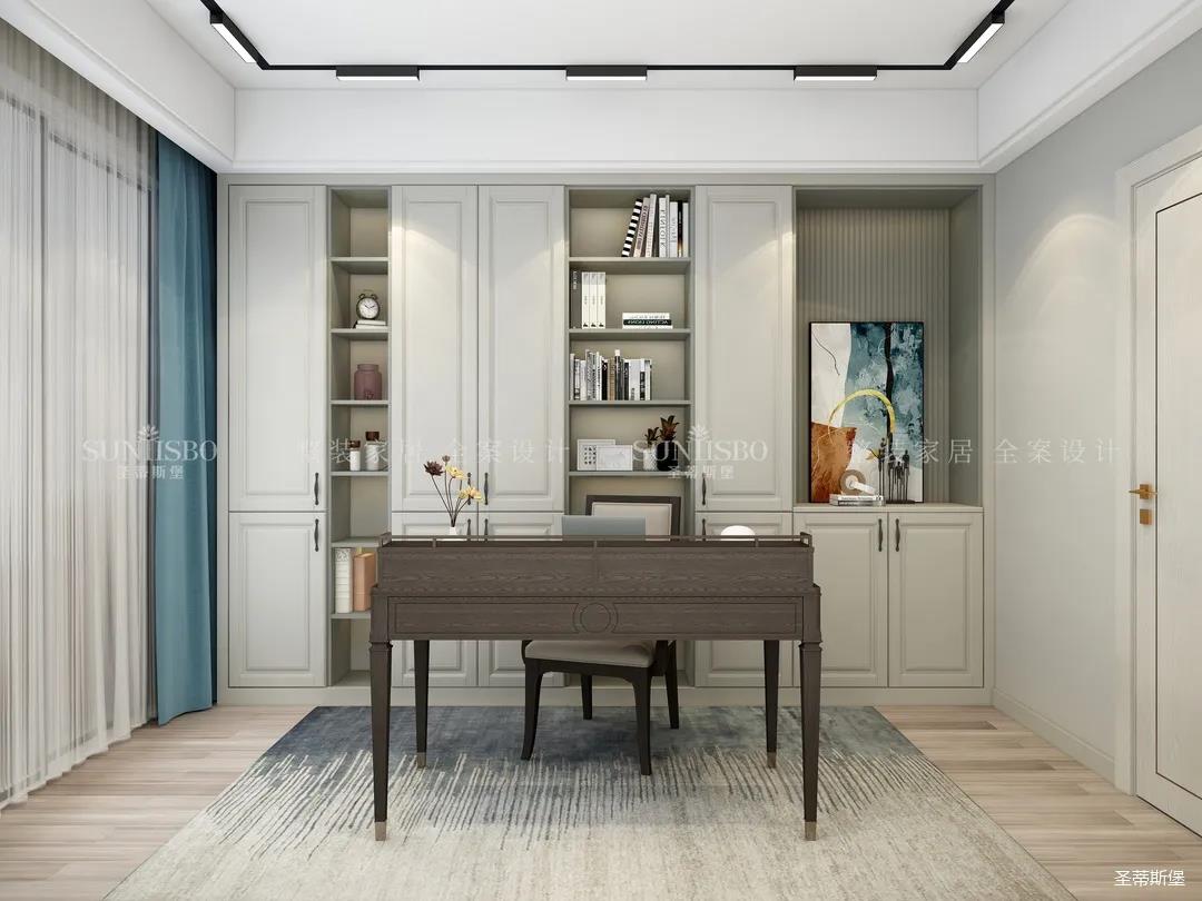 書房以黑白灰,作為打造舒適家居的經典配色。深灰書桌,淺灰地毯,仿古白定制書柜,三者搭配帶著與生俱來的時尚藝術范。整體沒有絢麗多彩的顏色,卻總能令人耳目一新,只一眼便愛上這舒適的閱讀空間。