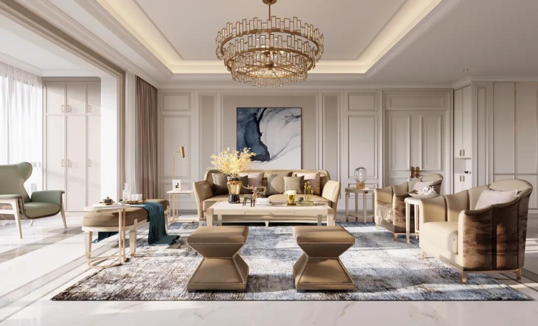 本案定位美式輕奢風(fēng)格,設(shè)計(jì)師提取了業(yè)主喜歡的顏色添加至空間中,并運(yùn)用金屬元素滲透到每一個(gè)空間,統(tǒng)一色調(diào)。在設(shè)計(jì)上,格局大而不空,以優(yōu)美線條雕琢空間語(yǔ)言,材質(zhì)肌理間的碰撞融合,打造出層次豐富的藝術(shù)感。